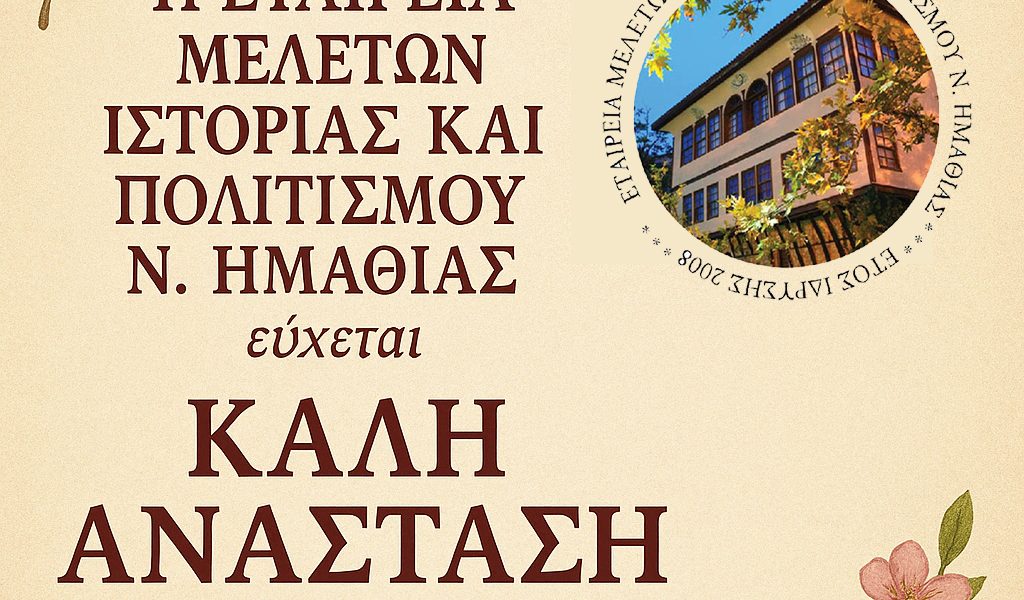 Η Εταιρεία Μελετών Ιστορίας και Πολιτισμού Ν. Ημαθίας εύχεται στα μέλη και στους φίλους της Καλή Ανάσταση.
