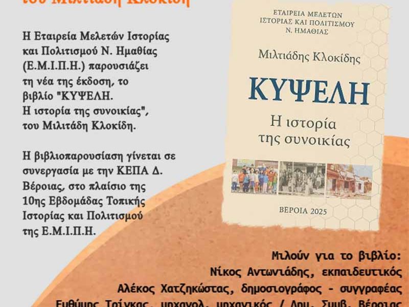 Η Εταιρεία Μελετών Ιστορίας και Πολιτισμού Ν. Ημαθίας (Ε.Μ.Ι.Π.Η.) παρουσιάζει τη νέα της έκδοση, το βιβλίο του Μιλτιάδη Κλοκίδη με τίτλο: «ΚΥΨΕΛΗ. Η ιστορία της συνοικίας».