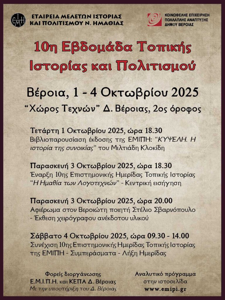 Η Εταιρεία Μελετών Ιστορίας και Πολιτισμού Ν. Ημαθίας (Ε.Μ.Ι.Π.Η.) διοργανώνει την 10η Εβδομάδα Τοπικής Ιστορίας και Πολιτισμού (1 – 4 Οκτωβρίου 2025).
