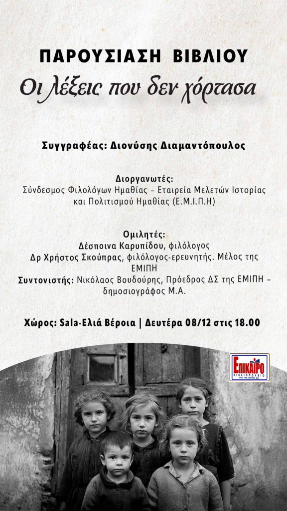Την βιβλιοπαρουσίαση διοργανώνουν ο Σύνδεσμος Φιλολόγων Ημαθίας και η Εταιρεία Μελετών Ιστορίας και Πολιτισμού Ν. Ημαθίας.