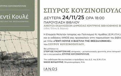 Η Εταιρεία Μελετών Ιστορίας και Πολιτισμού Ν. Ημαθίας (Ε.Μ.Ι.Π.Η.), σε συνεργασία με τις εκδόσεις IANOS διοργανώνει την παρουσίαση του νέου βιβλίου του Σπύρου Κουζινόπουλου με τίτλο: «Γεντί Κουλέ – Η Βαστίλη της Θεσσαλονίκης» Η εκδήλωση θα πραγματοποιηθεί: Δευτέρα 24 Νοεμβρίου 2025 Ώρα 18:00 Αίθουσα Εκδηλώσεων της ΔΗΜΟΣΙΑΣ ΚΕΝΤΡΙΚΗΣ ΒΙΒΛΙΟΘΗΚΗΣ ΒΕΡΟΙΑΣ (οδός Έλλης 8, Βέροια) Ομιλητές […]